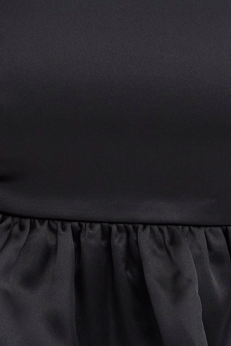 Black Crop Top Long Sleeve Square Neck Frill Hem Satin