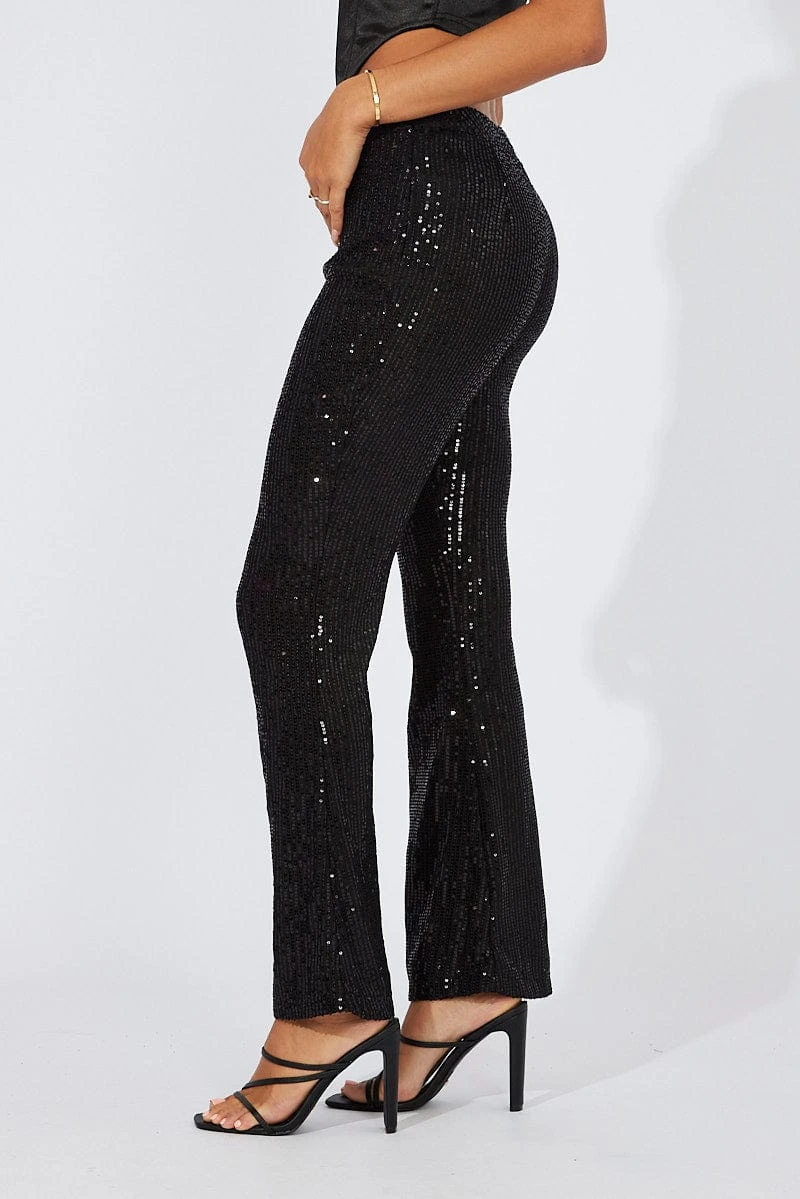 Black Flare Leg Pants High Rise Metallic