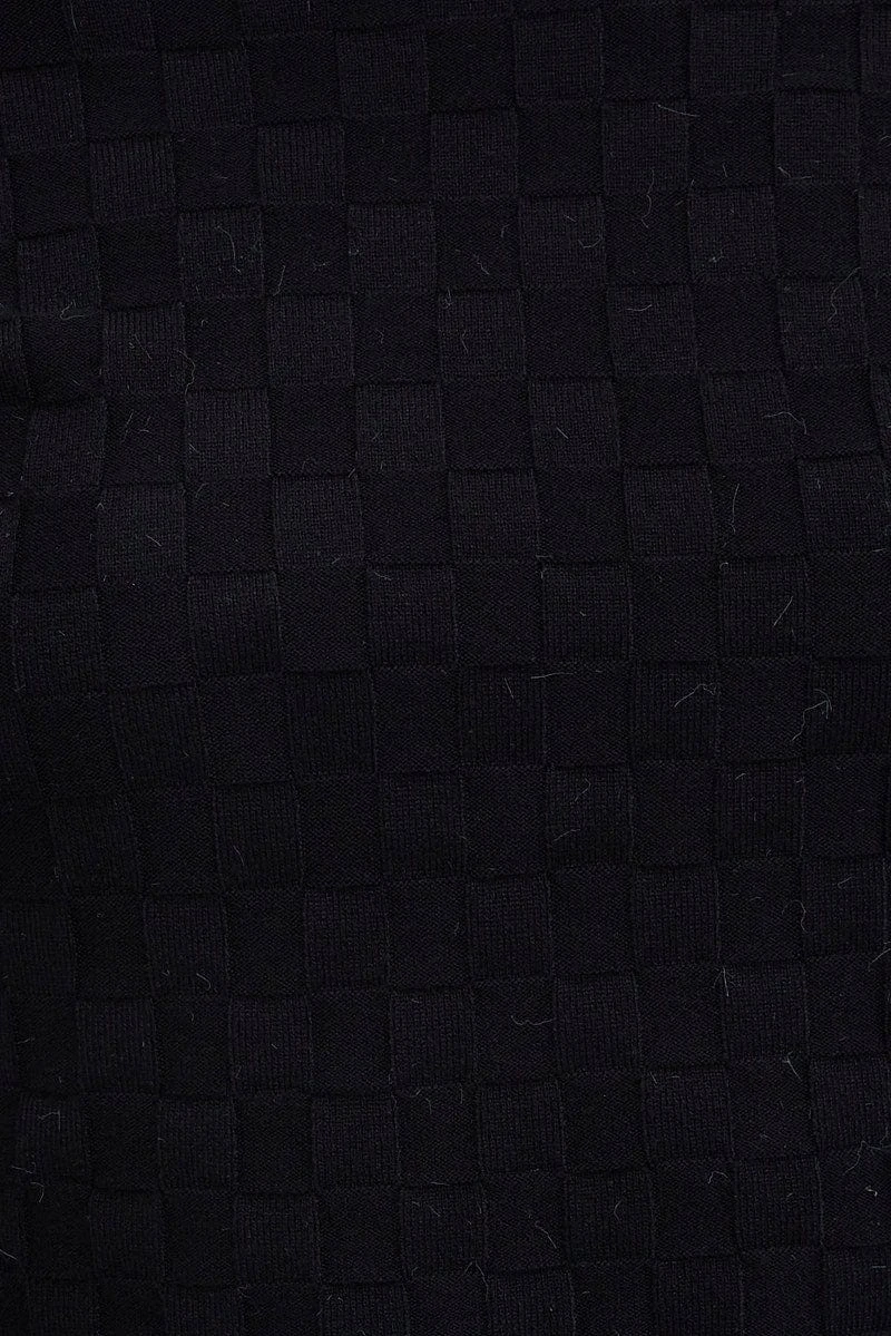 Black Knit Top Long Sleeve High Neck Crop Checker Stitch