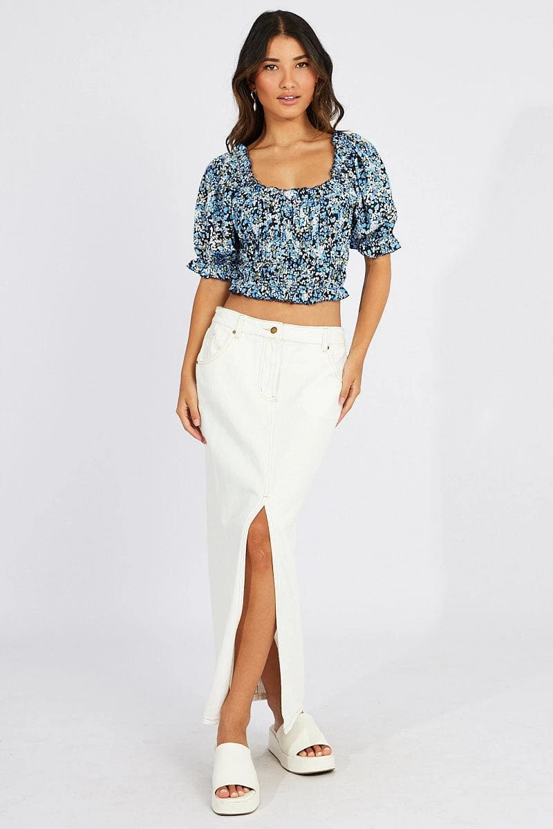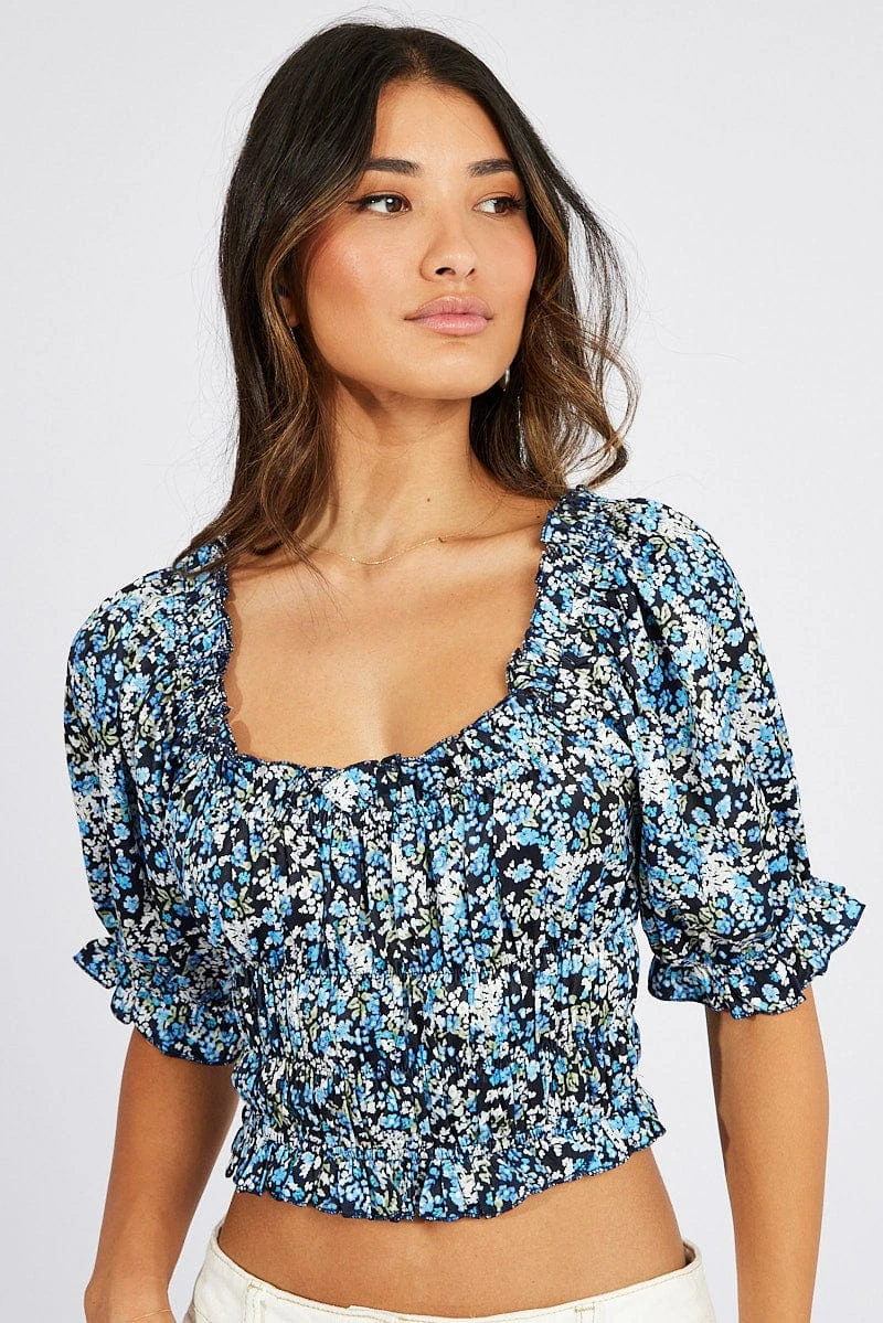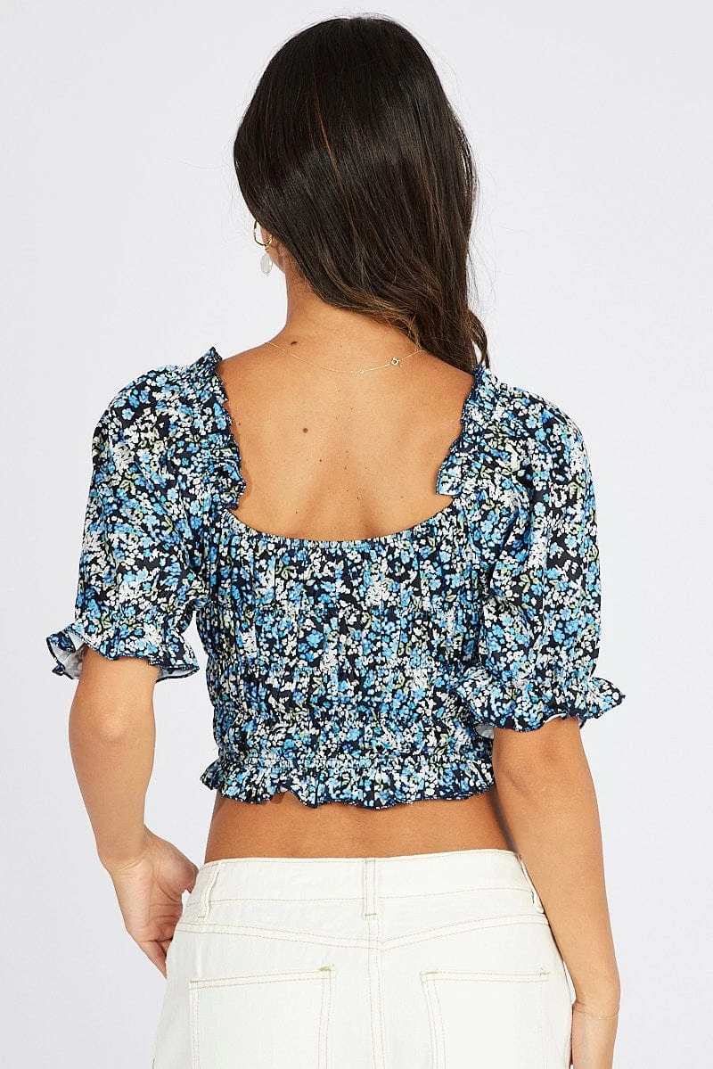 Blue Ditsy Crop Top Short Sleeve Satin