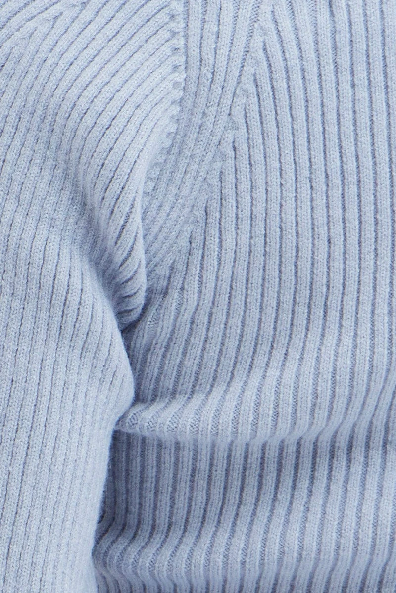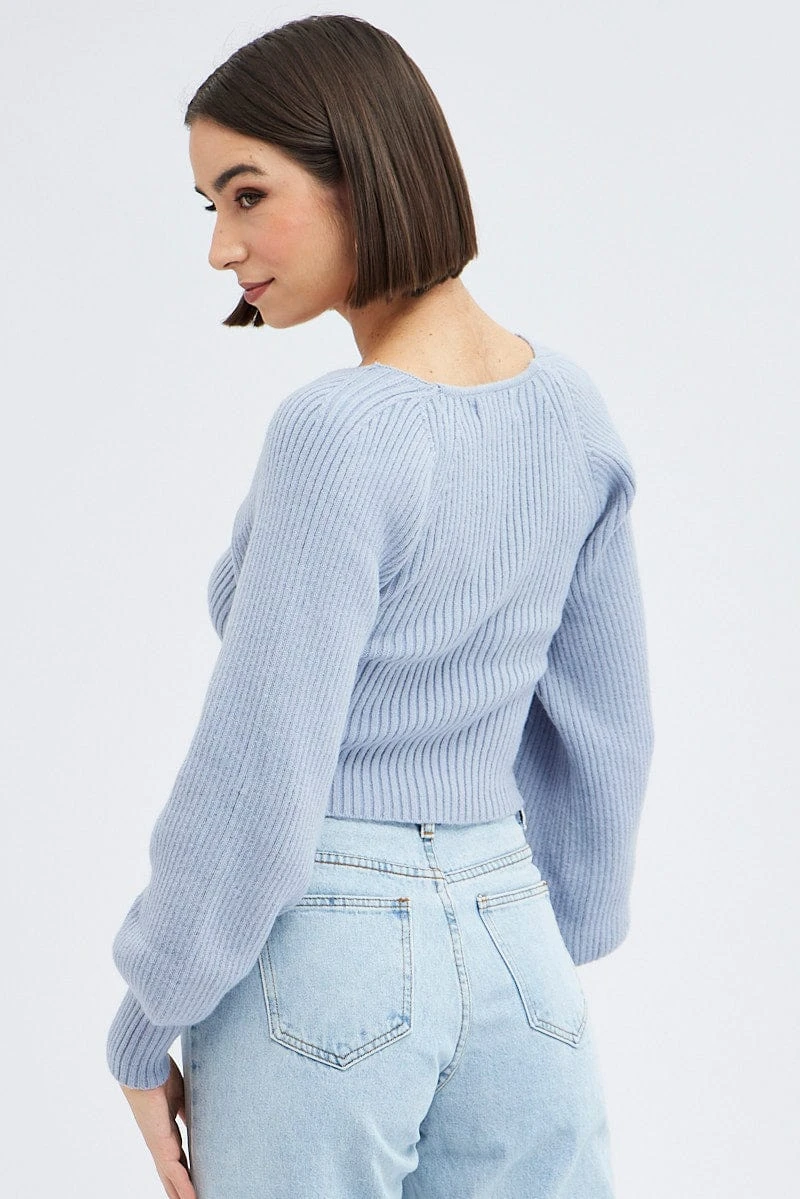 Blue Knit Top Sweet Heart Neck Volume Sleeve Crop