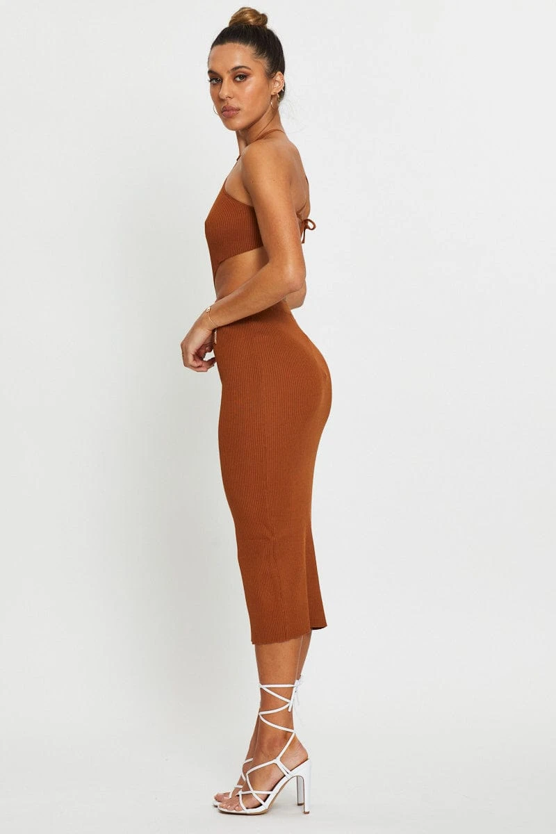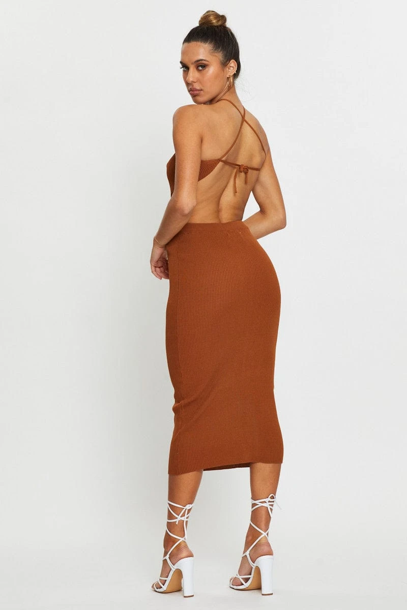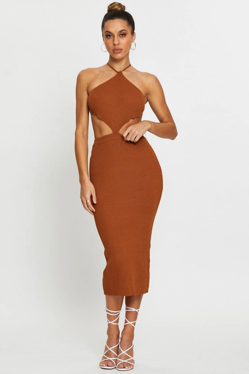 Features: Cut Out Detail, Halter Neck, Midi Length, Ribbed Knit