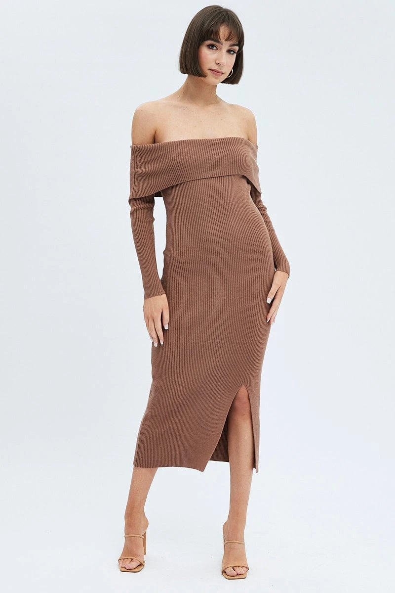 Brown Midi Dress Long Sleeve Off Shoulder Bardot Knit