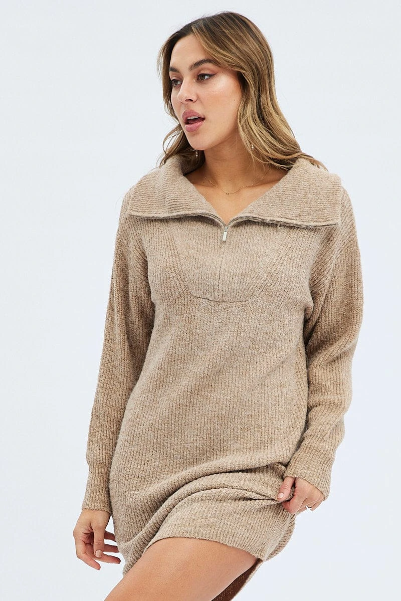 Camel Knit Dress Long Sleeve Turtleneck Zip