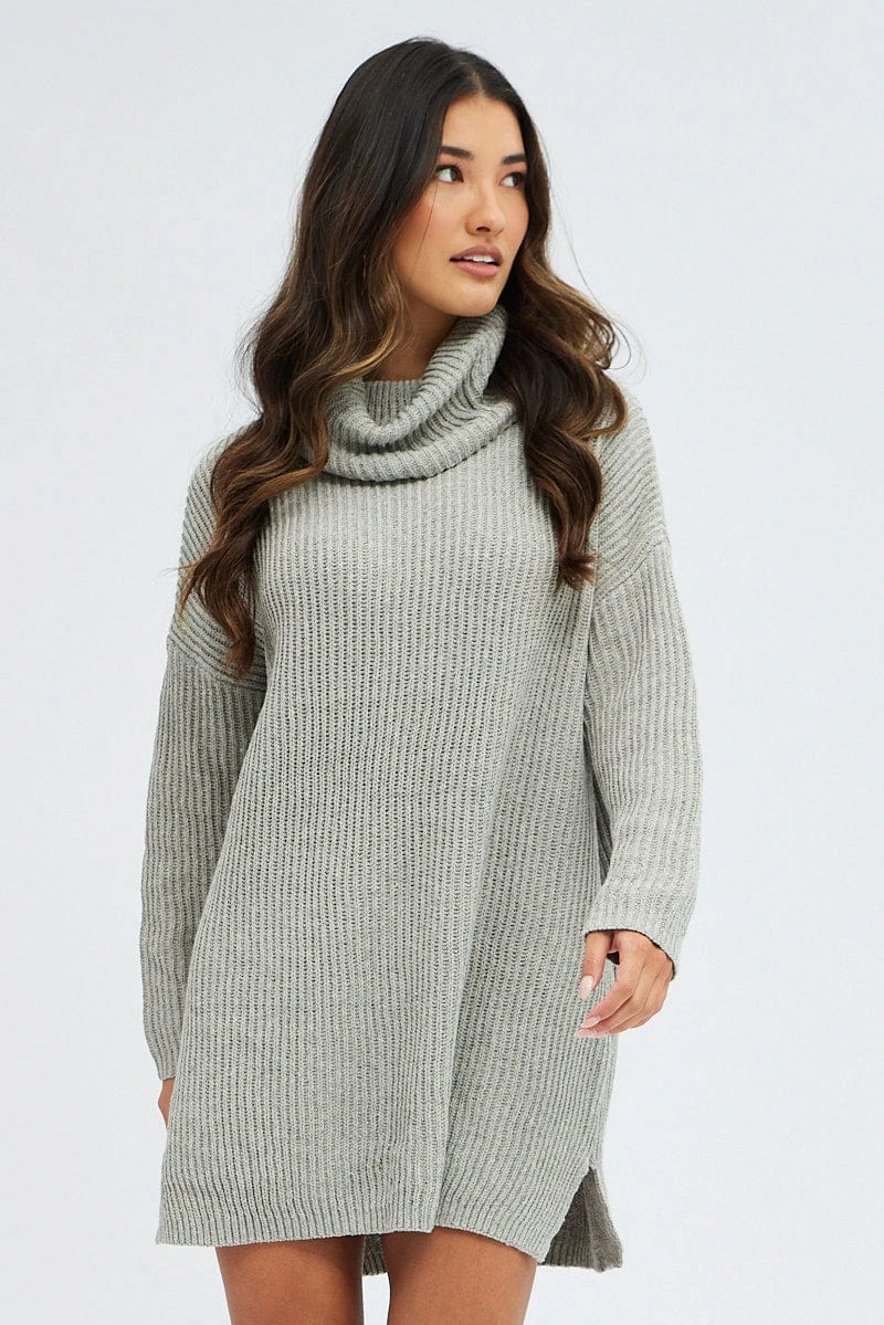 Grey Knit Dress Turtle Neck Long Sleeve Mini