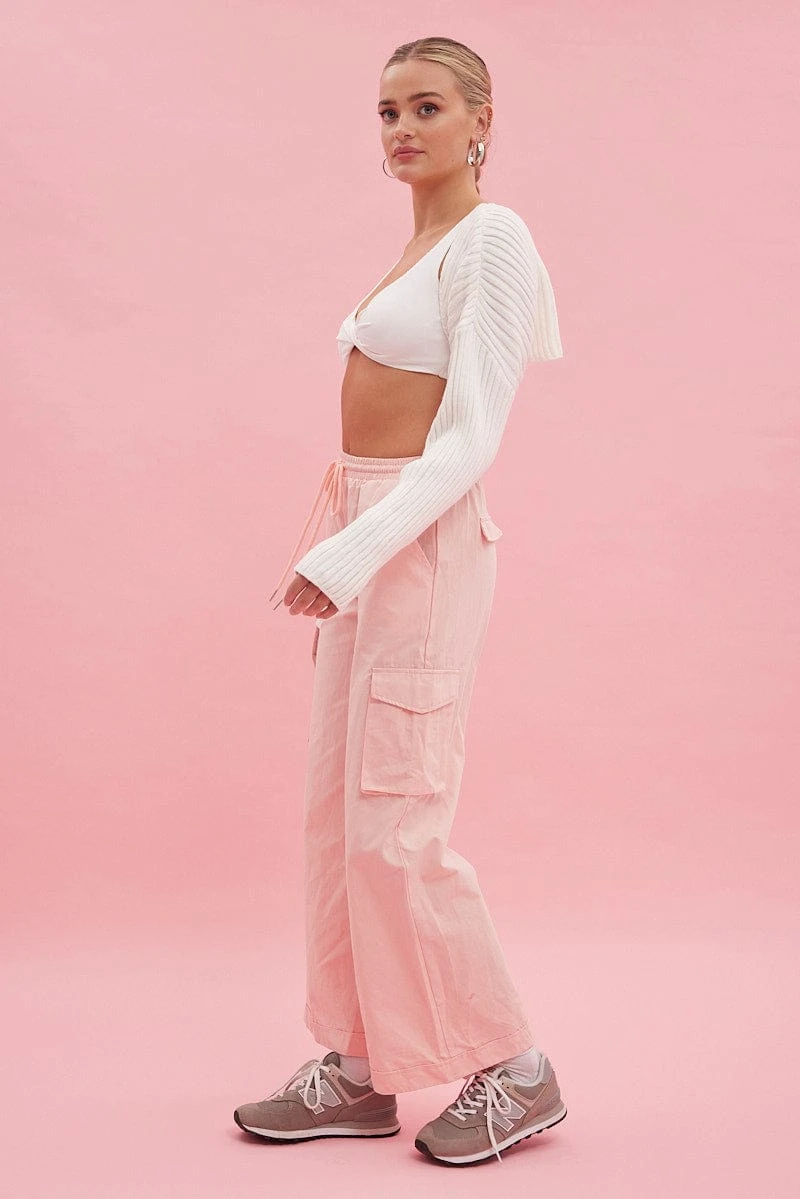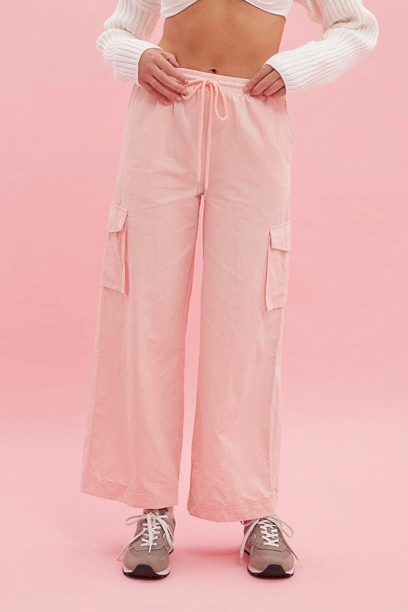 Pink Cargo Pant Wide Leg Elastic Waist Cotton Twill