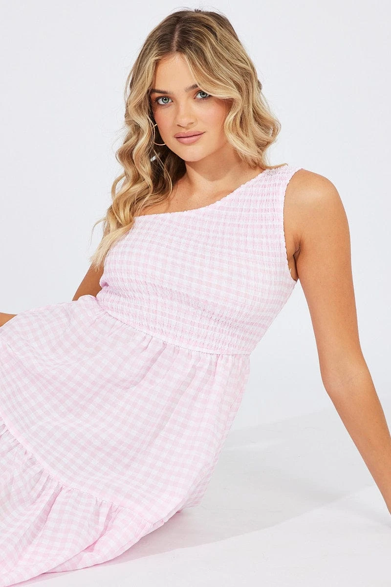 Pink Check Midi Dress One Shoulder