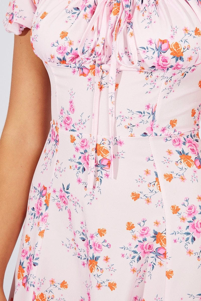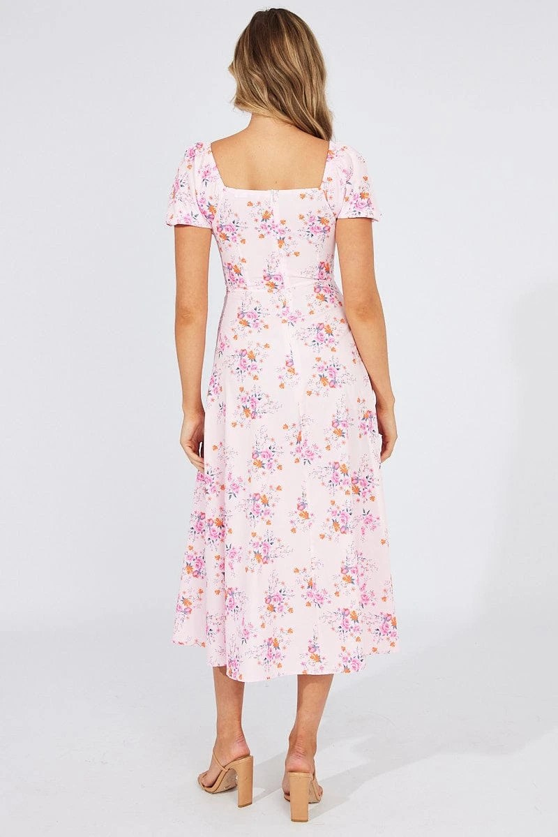 Pink Floral Ruched Bust Midi Dress Short Sleeve