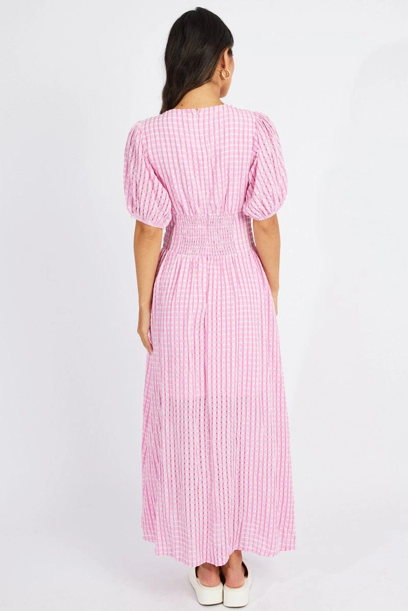 Pink Midi Dress Puff Sleeve