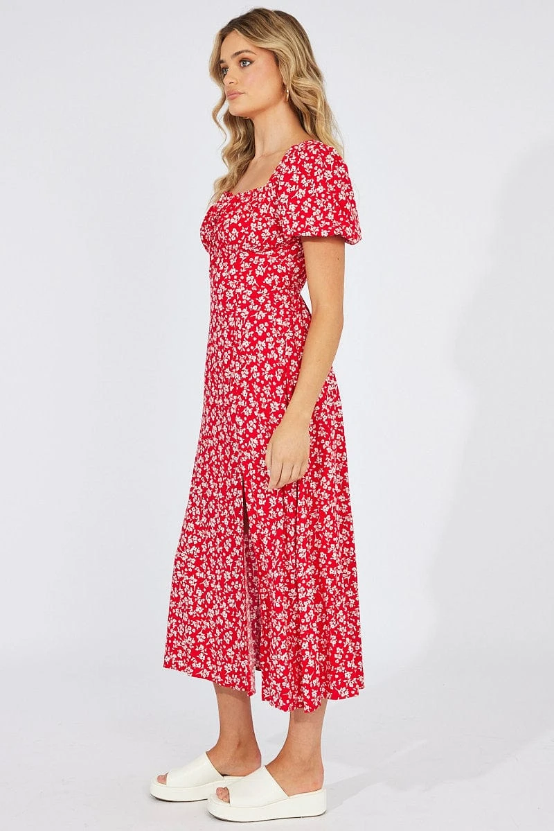 Red Ditsy Midi Dress Short Sleeve Ruched Bust