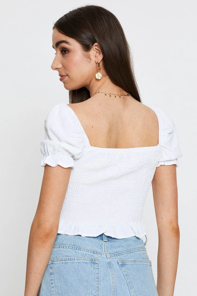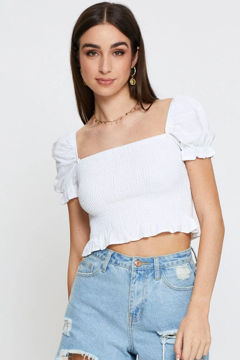 Features: Shirred Waist, Puff Sleeves, Cropped Length, Stretch